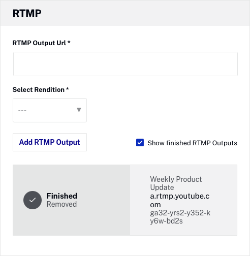 RTMP 出力が削除されたときのオプション完成した RTMP 出力を表示使えるようになる。完了したRTMP出力を表示するには、このオプションをオンにします。