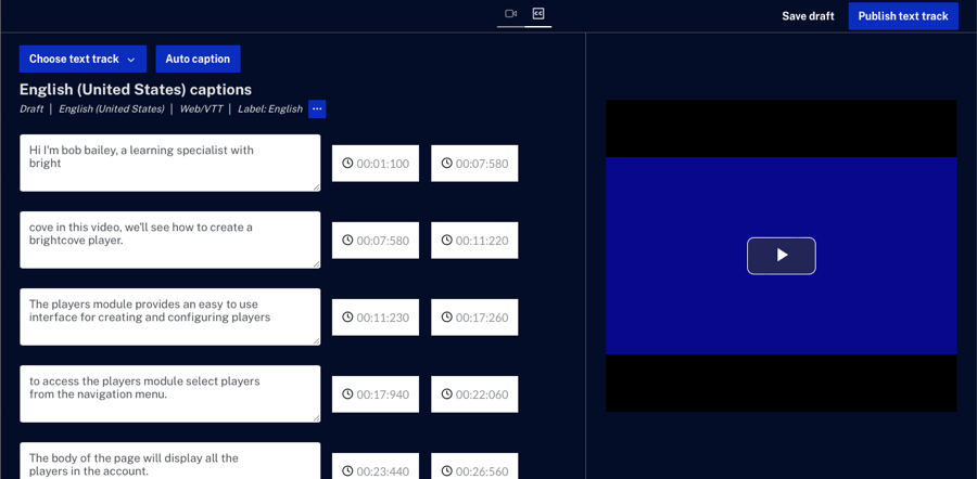 Once captions have been added to videos, the caption editor can be used to edit the caption files. The text tracks properties can be configured to provide captions for a video.