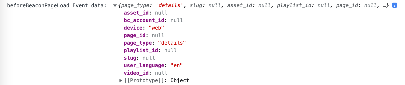 onBeaconPageLoad- When this event is triggered, you can add custom buttons, populate custom sections, and create custom pages for your {{ site.product_short }} web apploadedBeaconVideoMetadata- When this event is triggered, you can display data for the current video in your {{ site.product_short }} web app