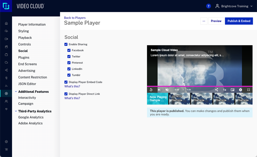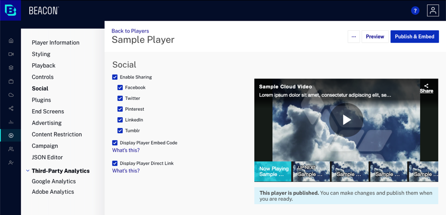 Players can be configured so the video content can be shared to popular social media sites. When social sharing is enabled, a share icon will appear in the title and description dock.