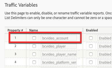 The image below shows Traffic Variables created for each of the Brightcove parameters.