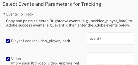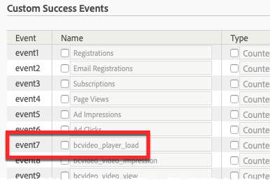 Every Brightcove event that will be tracked must be created as a Custom Success Event in Adobe Analytics. The event IDs from Adobe will then be used inside the Players module. This allows Brightcove event data to be passed to Adobe Success events. Review the list of events below to determine which events you want to track.