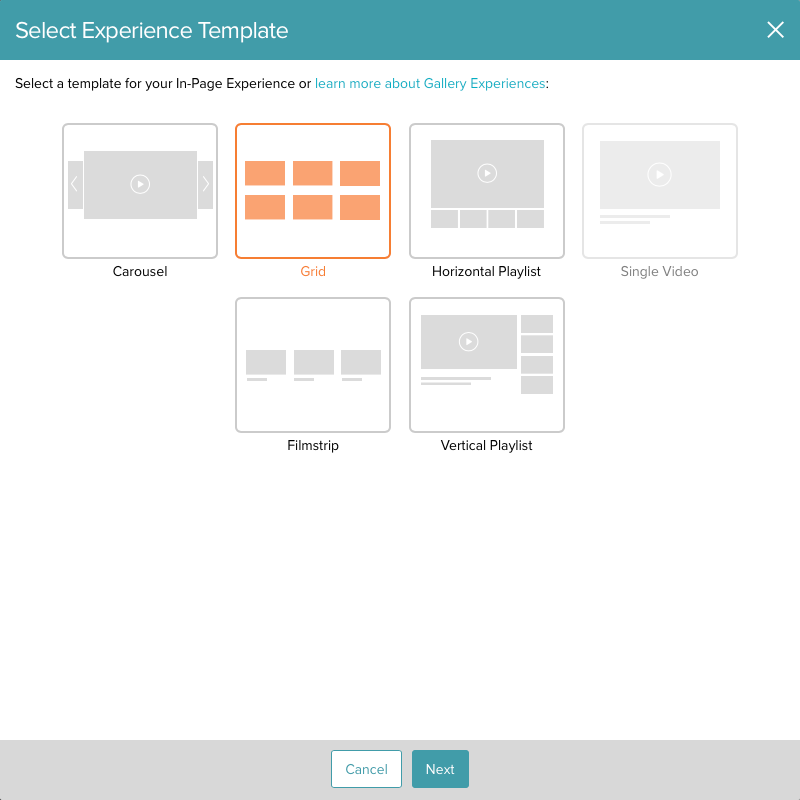 In-page experiences are created using the Gallery module and allow one or more videos, or a playlist, to be published on a page. The videos can appear in carousels, grids, and playlists that dynamically change before, during and after video play. Interactive elements can also be added, both inside and outside the video player. These in-page experiences can then be easily embedded in websites, landing pages, blogs, and email campaigns.